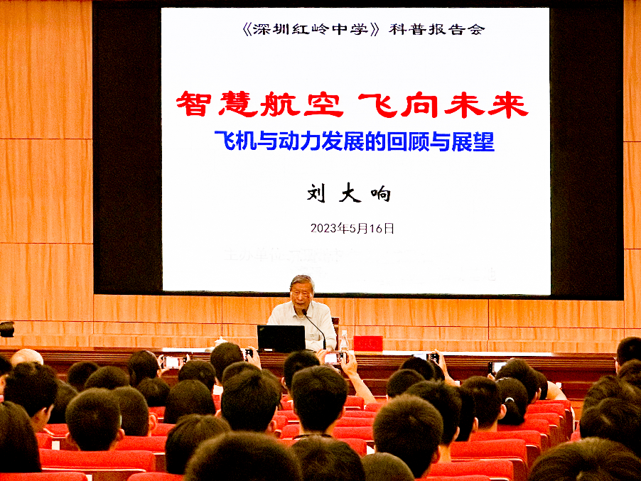 5月16日,刘大响院士走进广东省深圳市红岭中学开展“院士进中学”活动,主讲“智慧航空 飞向未来”的主题讲座。刘大响为同学们生动地讲述了飞机制造与动力技术的发展过程,回顾了中国航空发展历史上的重要里程碑时刻,展望未来中国航空航天科技美好前景,展现了为中国航空工业踔厉奋发的北航故事,北航人的空天报国精神引发员工深深共鸣。报告会前,广东招生组与红岭中学举行了优质生源基地校签约授牌仪式,与红岭教育集团党委书记张健、副董事长郭树英等领导老师就优质生源输送进行深入交流,招生组和深圳员工会从多个角度向红岭中学师生介绍了北航专业设置、特色优势、招生政策、校园生活、就业发展,激励同学们向北航行。