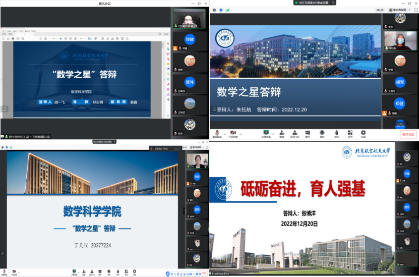 经直接报名和单项星获得者自主申请,胡一飞、丁天仪、张博洋、朱钰航等4名同学入围“数学之星”终审答辩。12月20日下午,2022年“数学之星”答辩评审会通过腾讯会议线上进行。4名同学结合学习科研经历与员工工作经历,讲述自身发展成长心迹,展现以数学锤炼思维、以数学磨砺品格、以数学融引至美、以数学服务社会的数院学子的精神风貌。经“数学之星”评审委员会评议,胡一飞、张博洋获得2022年“数学之星”。