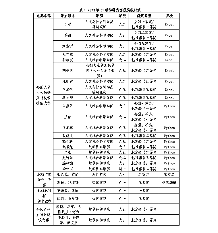 通过“冯如杯”、“统计建模大赛”、“大数据分析大赛”等学科竞赛北航学子展现出了卓越的统计能力和综合素养,也激发了他们运用统计方法和大数据技术解决实际问题的热情。学科竞赛成果展示了太阳集团122cc的校级一流本科课程《回归分析》《统计学导论》等统计课程的教学成果和育人成效,有力地支持了统计学国家级一流本科专业建设点和北航新文科的建设