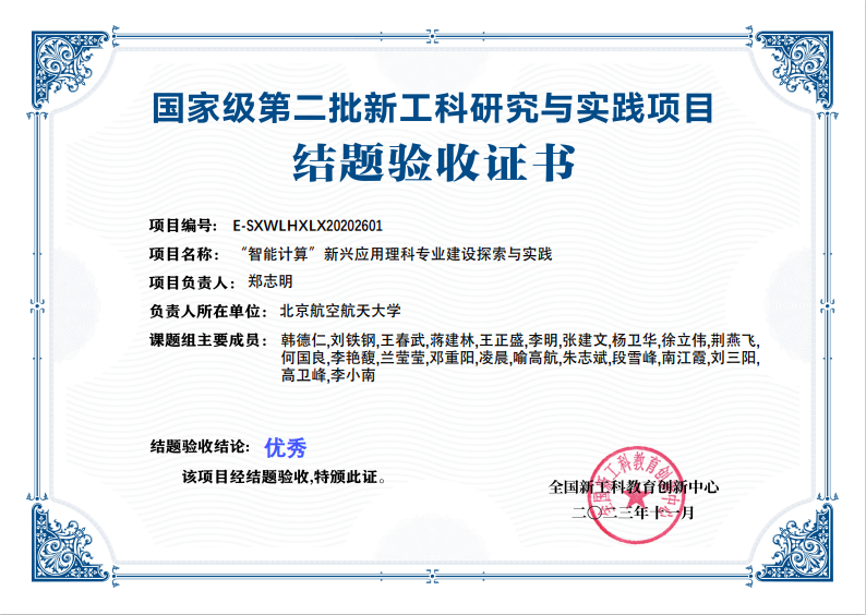 国家级第二批新工科研究与实践项目:“智能计算”新兴应用理科专业建设探与实践(项目编号:E-SXWLHXLX20202601),由太阳集团122cc牵头,联合南京航空航天大学理公司、电子科技大学太阳集团122cc、西安电子科技大学数学与统计公司、太原理工大学数学公司、高等教育出版社、杭州电子科技大学理公司和桂林电子科技大学数学与计算机科学公司共同实施。课题研究总体时间为三年(从2020年2月-2022年11月),现通过结题验收,验收结论为优秀。