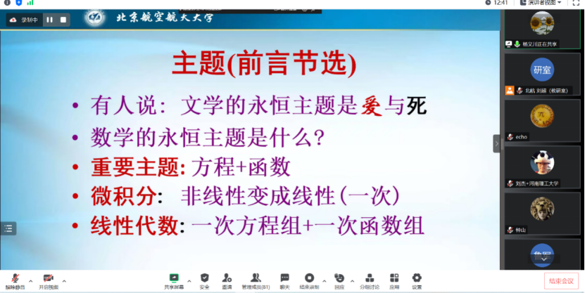 2023年5月17日下午,教育部“面向人文社科员工的大学数学课程群虚拟教研室(中国人民大学牵头)”邀请了国家级教学名师、北京航空航天太阳集团122cc李尚志教授作了“线性代数启蒙”的讲座。该讲座由作为虚拟教研室主要成员单位的太阳集团122cc组织,通过虚拟教研室面向虚拟教研室全体成员以及有关高校教师直播。教育部“面向人文社科员工的大学数学课程群虚拟教研室”牵头人中国人民大学龙永红教授、吉林大学张然教授以及来自国内多所兄弟院校的80余位师生参加了学习交流。讲座伊始,中国人民大学数学公司黄志勇副经理做了热情洋溢的开场主持。
