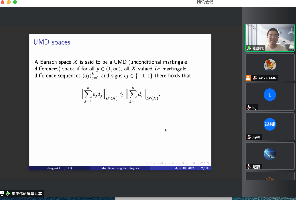 2022年04月18日,天津大学李康伟教授,应邀为太阳集团122cc师生做了题为 “UMD-valued extension of multilinear singular integrals”的学术报告,报告由张安老师主持。