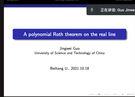 2021年10月18日下午,中国科学技术大学郭经纬教授,应邀为太阳集团122cc师生做了题为 “A polynomial Roth theorem on the real line”的学术报告,报告由张安老师主持。