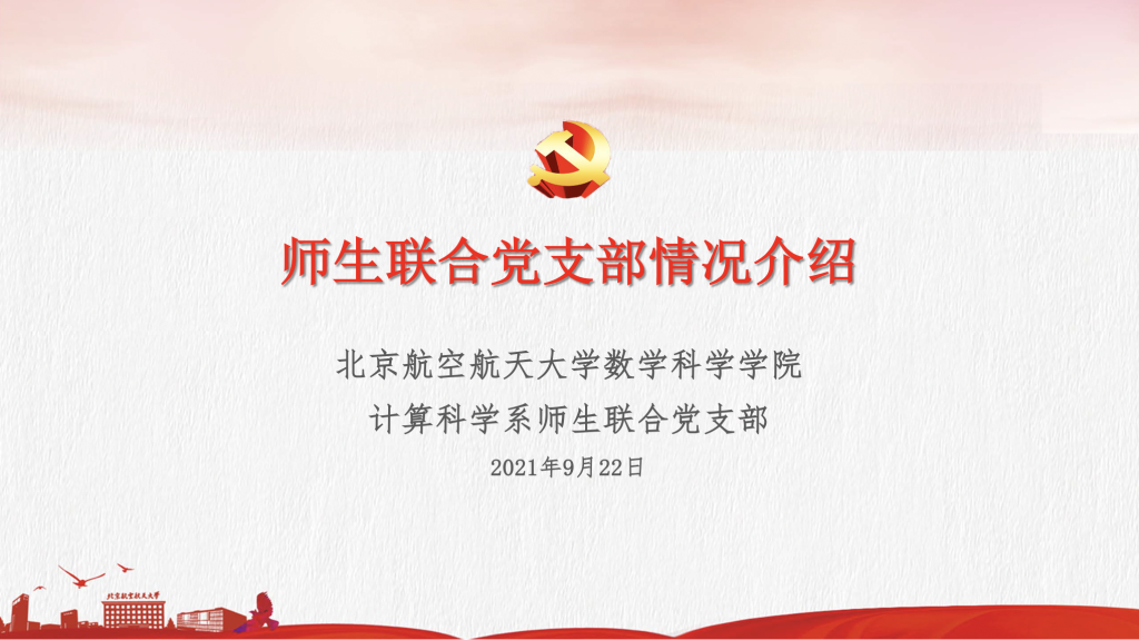 2021年9月22日下午,北航太阳集团122cc计算科学系师生联合党支部在主楼E405开展迎新活动,迎接支部新成员。11名来自计算科学系的2020级和2021级的研究生党员充实到支部中,为党支部注入了新鲜的力量。师生联合支部是全国党建工作样板支部建设单位,是数学科学公司党建工作的一项创新,迎新活动也是师生联合支部区别于单一教工和员工支部的重要活动。