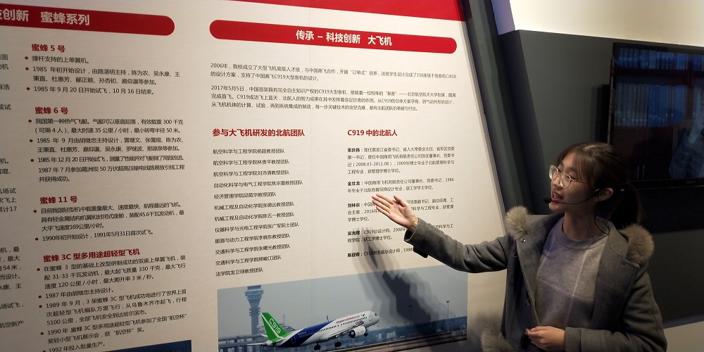 最后,同学们来到了“砥砺奋进,空天报国“——五年成就展。”五年成就展“集中展示了党的十八大以来,北航人不忘初心,跨越发展的五年,总结了五年来北航在团队建设、人才培养、人才引育、科研创新、国际交流合作、民生、党建等方面的历史成就。同学们领略到北航灿烂的成就,体会到数十载北航人艰苦奋斗精神的传承。