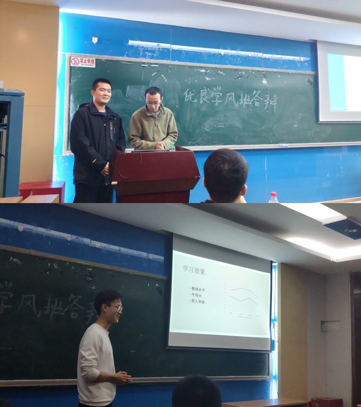 根据会前抽签,依次由160921班、160922班、160924班和160923班进行答辩。160921班通过大量的图表和照片展示了班级的风采,把班级学风建设活动和同学们的成绩进步情况清晰的展现出来。160922班用简洁的方式介绍了班级在学风建设中的努力,多名同学获奖经历让人印象深刻。160924班的PPT通过温馨的氛围向大家展示了班级建设,学习、工作、志愿多方面介绍了班级同学的团结和努力。160923班的答辩严格契合评分标准,在每个方面都进行了详细的展示。