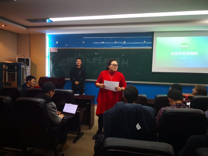 2018年11月9日,数学与系统科学公司本科生在主楼321教室进行了2018年优良学风班答辩,出席本次答辩会的有公司2016级各小班答辩代表和部分员工,公司党委副书记丁丁老师、班主任代表郑孝信老师、教务秘书曹安妮老师、2015级辅导员张孝涛和2016级辅导员刘禹吟担任评委。本次答辩会由1609大班宣传委员刘晋玮同学主持。