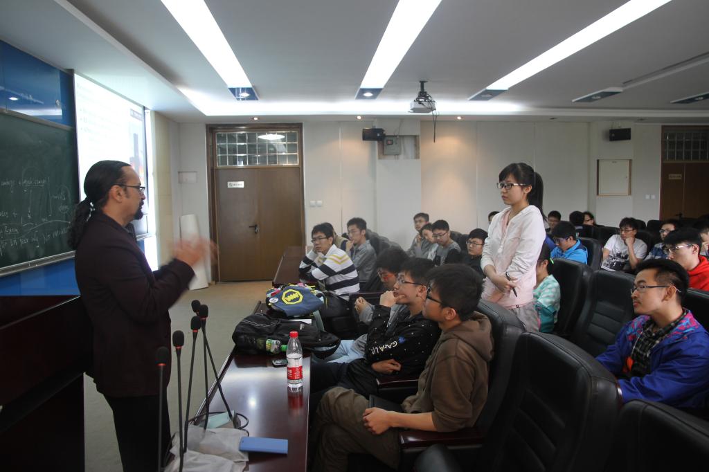 Lima-Filho教授首先向同学们展示了美国德克萨斯A&M大学理公司(TAMU Science Department)近年来的办学及发展概况,并详细介绍了理公司各个数学专业方向的人才培养计划包括各类专业所修的课程清单及未来就业方向。接下来他为大家介绍了“BUAA- TAMU数学专业本科生快车道”这一国际交换项目的具体情况,即在北航数学公司完成前三年的学业后申请去TAMU继续读一年的graduate和undergraduate混合的课程,然后由员工学习情况决定在接下来的一年内读完Master Degree或是直接去攻读PHD。接下来的互动交流环节中,同学们就当前关心的申请问题以及未来规划向Lima-Filho教授踊跃提问,教授清晰亲切的一一作答也解答了同学们心中存在的疑虑。此次座谈会进一步推进了公司与美国德克萨斯A&M大学的沟通,也为2015年华罗庚班的国际交流计划的实施拉开序幕。