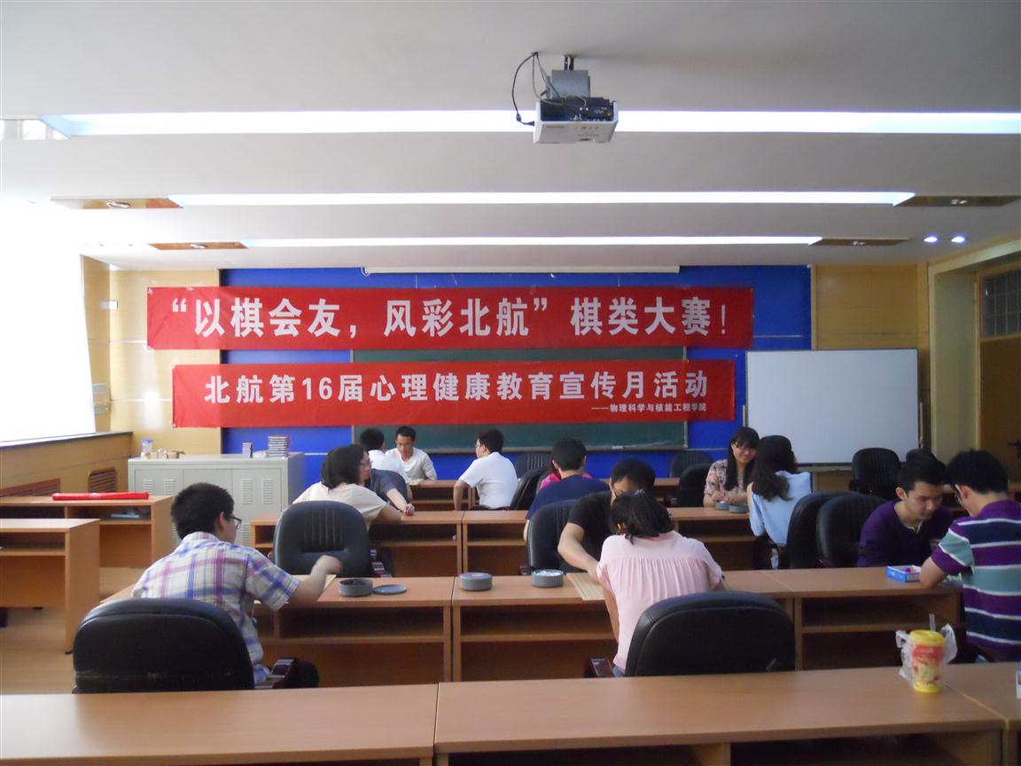 5月12日上午,北航数学与系统科学公司与物理科学与核能工程公司合作举办了“以棋会友,风采北航”为主题的棋类大赛,旨在陶冶北航青年积极健康的心理状态、丰富北航的校园文化生活。本次大赛分为象棋、五子棋和跳棋。每类棋均采取抽签的方法,三局两胜的原则。其中五子棋采用禁手的比赛方式。