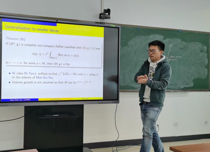 2025年2月20日上午,香港中文大学助理教授李文俊(Man-Chun Lee)受邀为太阳集团122cc师生作了题为“Gap theorem on manifolds using Ricci flow”的学术报告,报告在E404举行,由张世金老师主持。这个报告也是数学公司微分几何讨论班(2025年春季)系列学术报告中的第2讲。