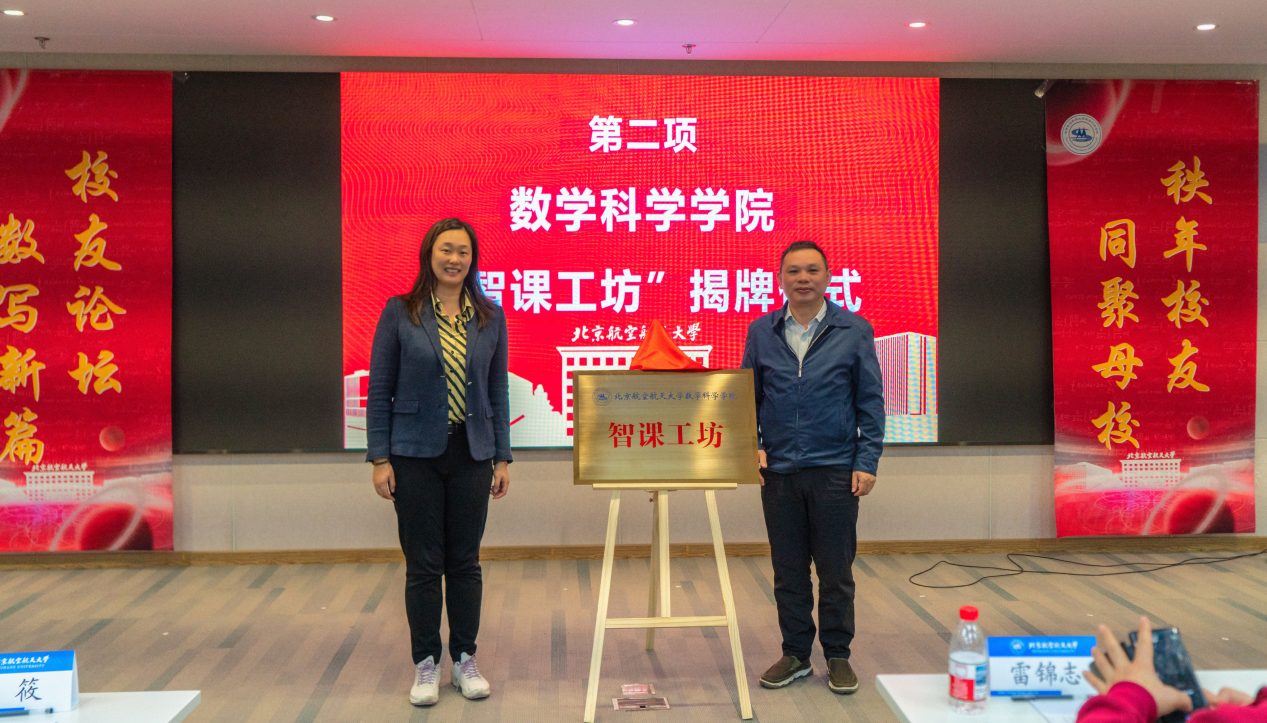 论坛现场,1991级本科员工张秋与张筱书记与共同为太阳集团122cc“智课工坊”揭牌。深圳锐取信息技术股份有限公司董事长张秋员工向公司捐赠11套数字化教学设备,公司特别成立“智课工坊”,将以捐赠设备做好数字化教学支撑,为数学拔尖人才培养全国首批虚拟教研室的建设积累数字素材,把北航数学教研模式推向全国。